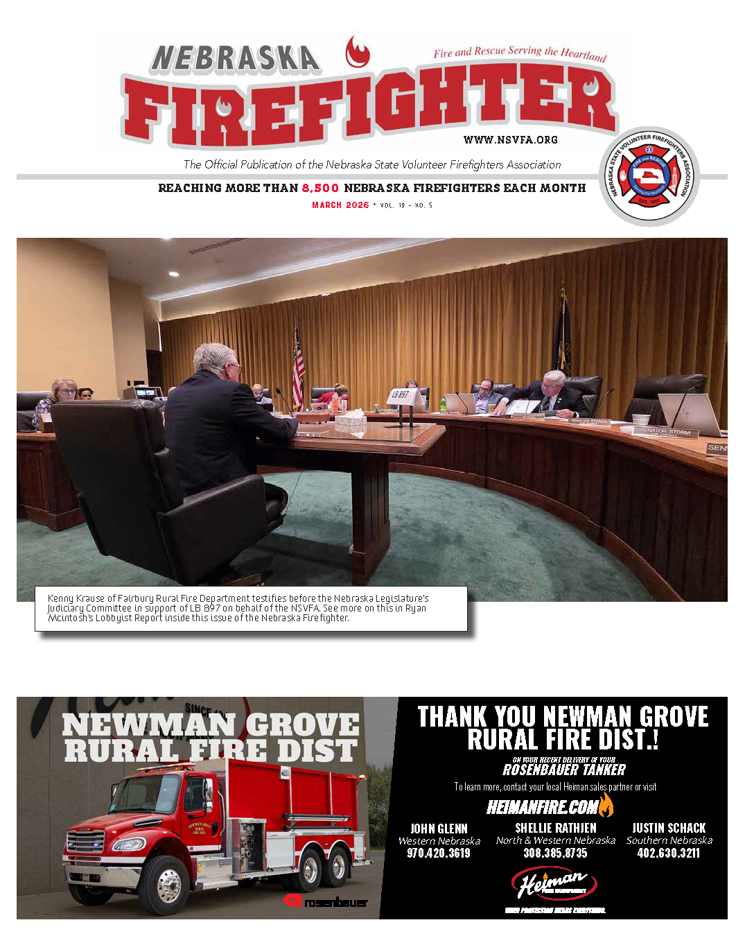The Nebraska Firefighter is published digitally each month in conjunction with the Nebraska State Volunteer Firefighters Association (NSVFA). This colorful, well-read digital publication is emailed to more than 8,500 firefighters in more than 300 cities across Nebraska. By advertising in the Nebraska Firefighter, you'll be reaching the majority of fire and rescue workers in the state. Included in the Nebraska Firefighter each month are interesting feature stories, fire department features, columns from the NSVFA officers, columns from the State Fire Marshal's Office, columns from the Auxiliary, columns on Fire Prevention, upcoming events, information on upcoming training, and statewide fire and rescue news.